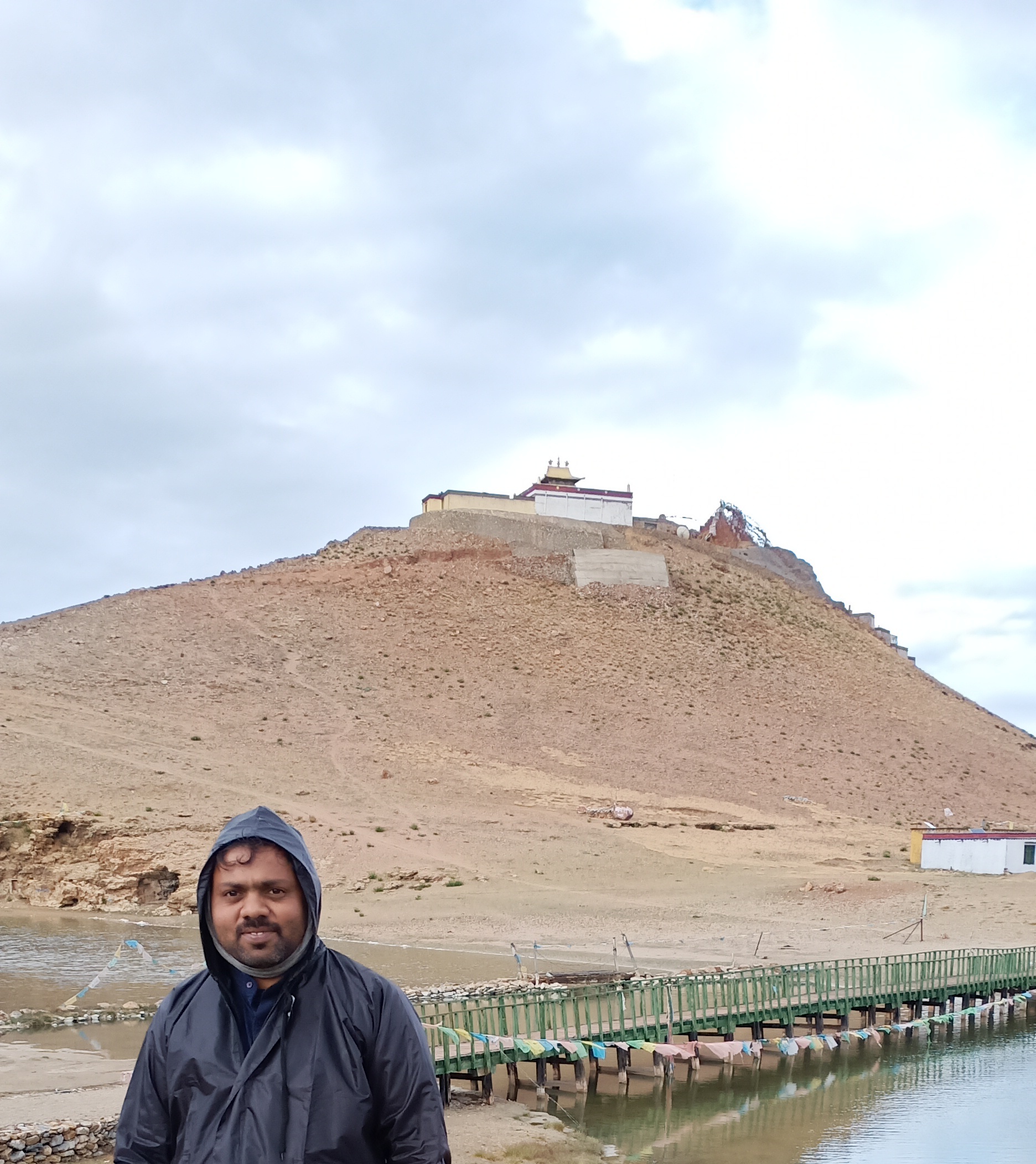 Early evening we reached our overnight abode. It was 10 minute walk away from the Mansarovar and had a hot water spring. That evening was young and overcast, we came out for a short walk and the heart yearned again to see Kailash. We asked the villagers, the direction they pointed towards, we couldn’t see anything for as long as we could see, let alone any mountain. Soon we spotted a monastery on top of a hill nearby and that looked like the ideal hill to hike to. Atleast from the top we can see all around. The idea was crazy as it started raining, the clouds were thick too but when the heart calls, there is no stopping.